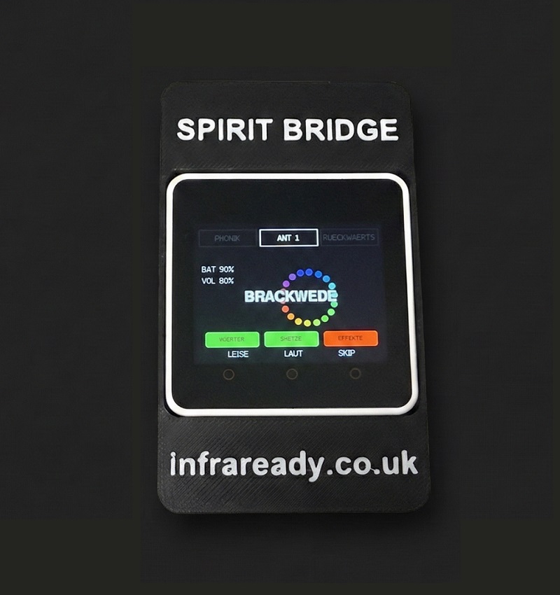 Willkommen bei der Spirit Bridge. Dies ist ein experimentelles ITK-Gerät (Instrumentelle Transkommunikation), das entwickelt wurde, um Echtzeit-Forschung zu ermöglichen. Es verwendet einen digitalen „Tape Loop“-Algorithmus, um Audiodateien aus drei verschiedenen Banken zu scannen, zu zerteilen und zu manipulieren, während gleichzeitig Wörter auf dem Display angezeigt werden.